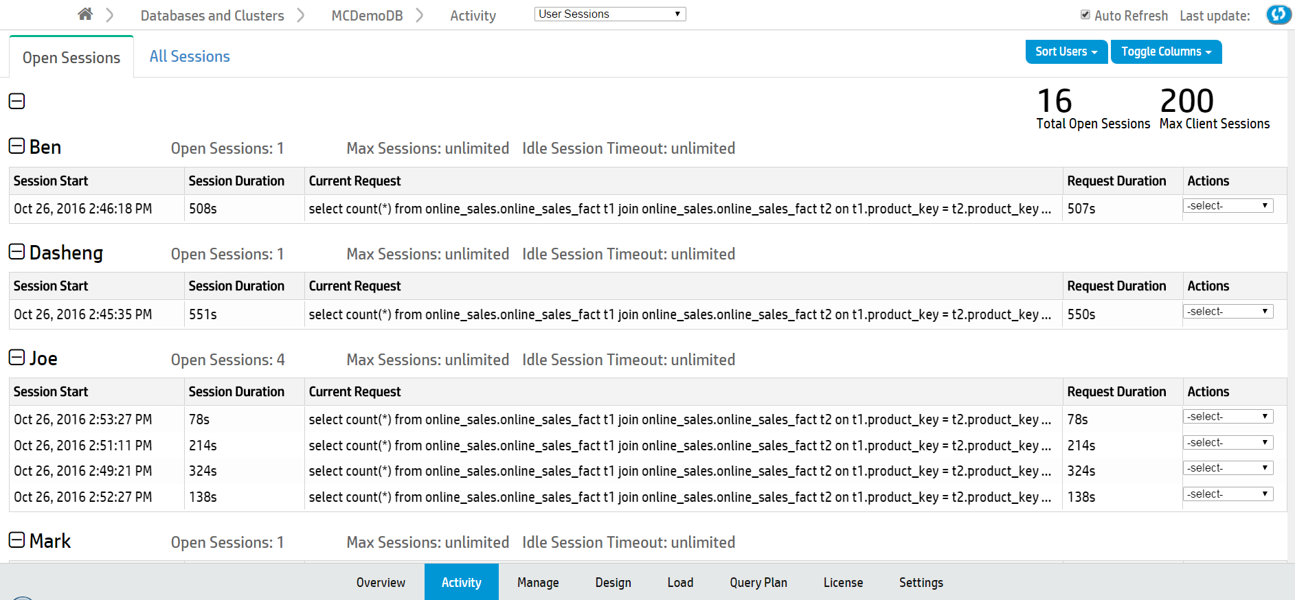 The Open Sessions tab displays a table of currently open sessions for each user. You can close a session or cancel a query on this tab by selecting that option from the Actions column.
