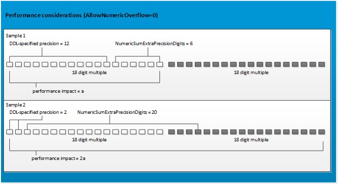 xis defined asx(12,0)and NumericSumExtraPrecisionDigits is set to 6: The database internally stays within the first multiple of 18 digits and no additional performance impact occurs (a). - Column