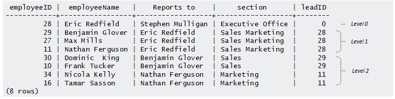WITH RECURSIVE managers (employeeID, employeeName, sectionID, section, lead, leadID)