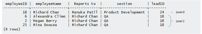 The WITH RECURSIVE clause executes as before, except this time it finds no more data after two iterations and exits. Accordingly, the primary query returns two levels of data from managers: